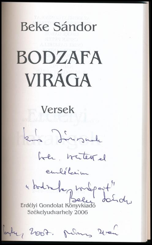 Leírás: Beke Sándor: Bodzafa virága. Versek. Székelyudvarhely, 2006., Erdélyi Gondolat Könyvkiadó. Kiadói papírkötés. A szerző által dedikált.