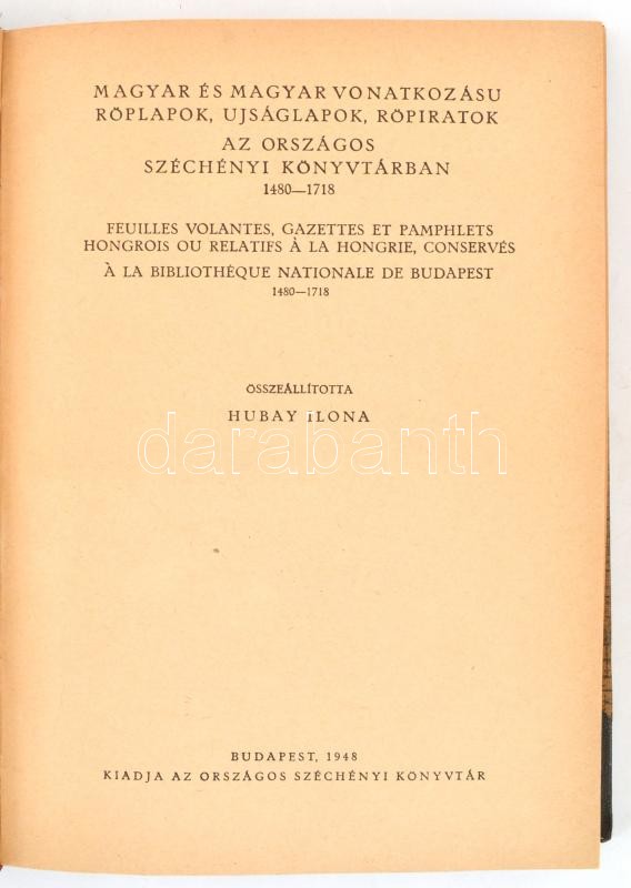 Magyar és magyar vonatkozású röplapok, újságlapok, röpiratok az Országos Széchényi Könyvtárban, 1480-1718. Feuilles volantes, gazettes et pamphlets hongrois ou relatifs á la Hongrie, conservés a la Bibliothéque Nationale de Budapest. 1480-1718. Országos Széchényi Könyvtár XXVIII. Bp., 1948., Országos Széchényi Könyvtár, XXV+3+307 p. Átkötött félvászon-kötés, volt könyvtári példány.