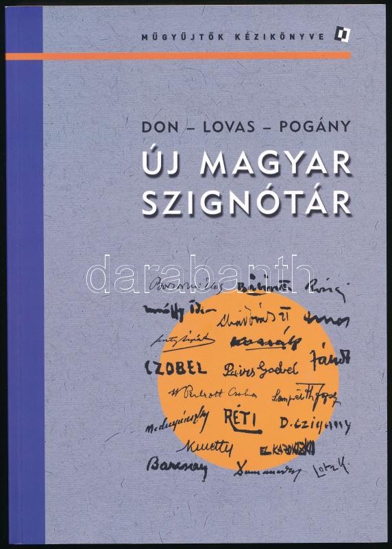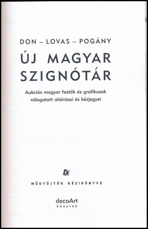 Don Péter- Lovas Dániel - Pogány Gábor: Új magyar szignótár. Aukciós magyar festők és grafikusok válogatott aláírásai és kézjegyei. Műgyűjtők Kézikönyve. DecoArt Könyvek. 11. Bp., 2010, Panton Bp., 159 p. Második, javított kiadás. Kiadói papírkötés, jó állapotban.