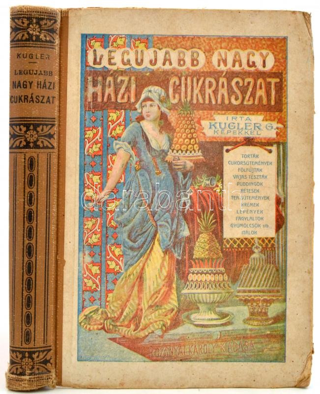 Kugler Géza: A legújabb és legteljesebb nagy házi cukrászat, cukrászok, vendéglősök, és háziasszonyok legpraktikusabb kézikönyve. Hatodik kiadás. Bp. é. n. Rozsnyai Károly, 424 p. Szövegközti és egészoldalas illusztrációkkal. Kiadói félvászon-kötés, kopott borítóval, az elülső borító alsó sarkán ütődéssel, az elülső és hátsó kötéstábla belsején, szenny- és előzéklapokon foxing foltokkal, de belül jó állapotban. A kötéstábla belsején az eredeti papírborító maradványaival.