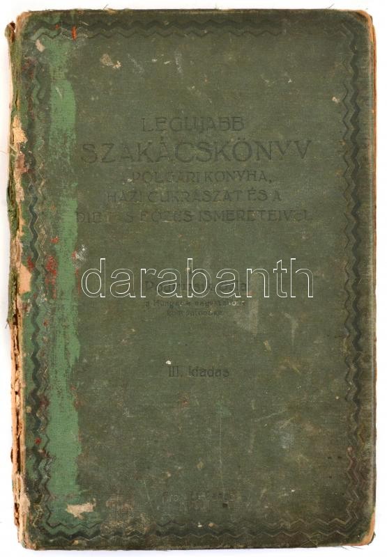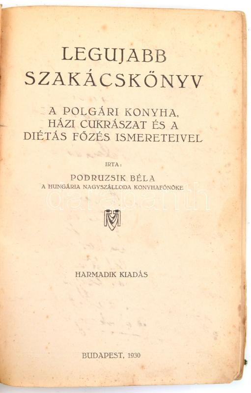 Podruzsik Béla: Legújabb szakácskönyv. A polgári konyha, házi cukrászat és a diétás főzés ismereteivel. III. kiadás. Bp., 1930, Otthon Nyomda, 363 p. Kiadói egészvászon-kötésben, kopott borítóval, sérült gerinccel, javított kötéssel, két kijáró lappal (183/184., 185/186.), az elülső szennylapon jegyzettel, megviselt állapotban.