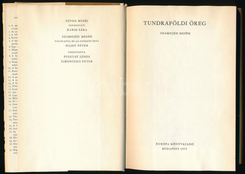 Tundraföldi öreg. Szamojéd mesék. Vál. és az utószót írta: Hajdú Péter. Ford.: Pusztay János, Simoncsics Péter. A könyv borító illusztrációja és az illusztrációk Lóránt Lilla munkái. Népek meséi sorozat. Bp., 1975, Európa.Kiadói félvászon-kötés, kiadói papír védőborítóban, jó állapotban.