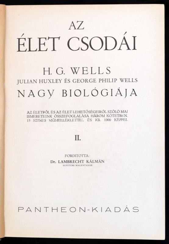 Az élet csodái II. kötet. H. G. Wells, Julian Huxley és George Philip Wells nagy biológiája. Fordította: Lambrecht Kálmán. Bp., é. n., Pantheon. Gazdag szövegközti képanyaggal. Kiadói aranyozott egészvászon-kötésben, kissé kopott borítóval, kissé laza fűzéssel.