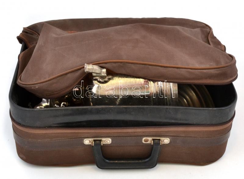 Leírás: Egy nagy méretű elektromos fém szamovár zsinórral, egy kisebb méretű, orosz népművészeti faragások, egy bőröndben