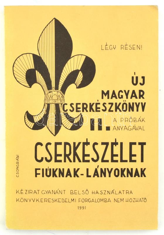 Csongrádi Jenő: Új magyar cserkészkönyv. Cserkészélet fiúknak-lányoknak. II. kötet. A könyv a magyar cserkészszövetség próbaszabályzatának figyelembevételével készült. H.n., 1991, Regnum Marianum. Kézirat gyanánt belső használatra. Könyvkereskedelmi forgalomba nem hozható. Gazdagon illusztrált. Kiadói enyhén kopott papírkötésben. 452. sz. Szent Bernát cserkészcsapat 8420 Zirc, Ciszterci Apátság bélyegzőjével az előzéklapon és hátul.