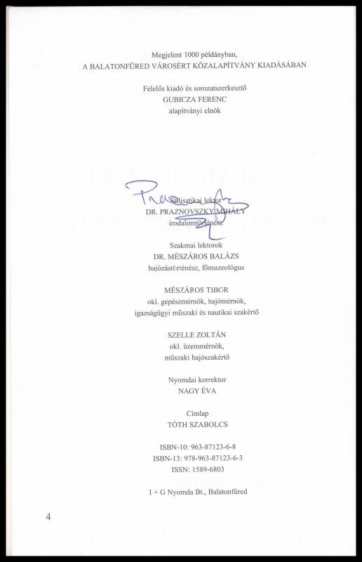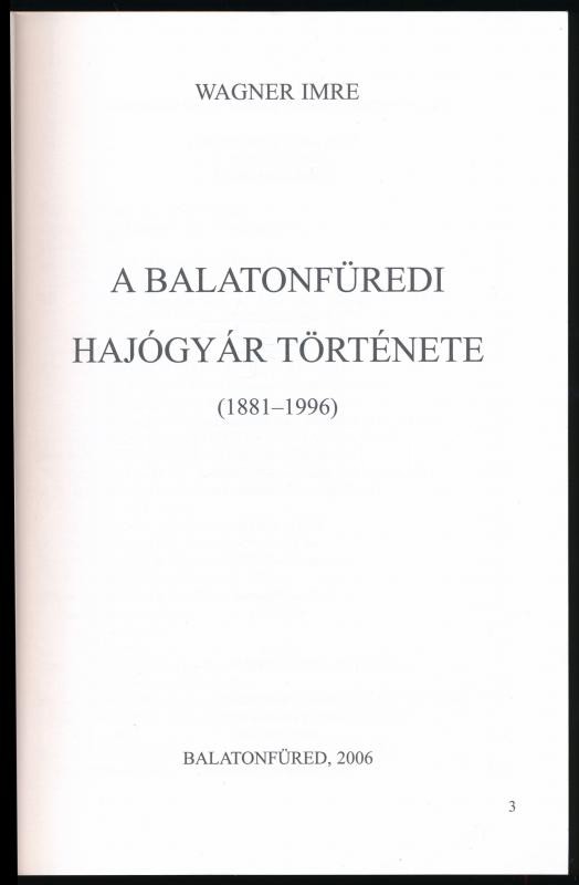 Wagner Imre: A Balatonfüredi Hajógyár története. 1881-1996. Balatonfüred, 2006., Balatonfüred Városért Közalapítvány. Gazdag fekete-fehér képanyaggal illusztrált. Kiadói papírkötés. Megjelent 1000 példányban. A stilisztikai lektor, Dr. Praznovszky Mihály aláírásával.