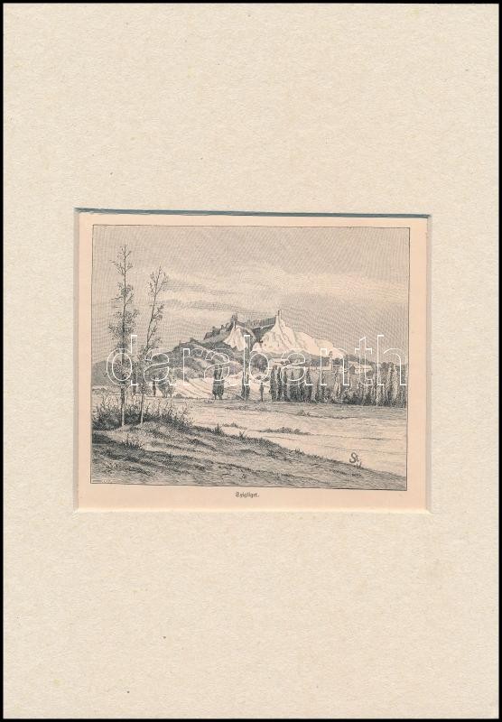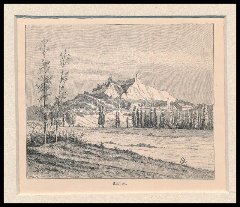Leírás: cca 1900 Morelli Gusztáv (1848-1909): Szigliget várának romjai, paszpartuban, német nyelven, fametszet, paszpartuban, 12x14 cm