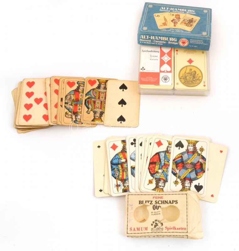 Vegyes kártyatétel: villámsnapsz eredeti szakadt borításban; römi-kanaszta-bridzs kártya eredeti dobozban, régi hamburgi képekkel; piatnik 52 lapos kártya, 1 hiányzik, egyik lapon kopott adóbélyeg