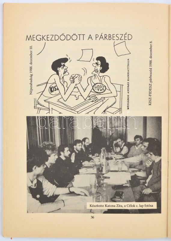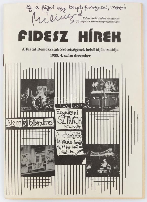 1988 Fidesz Hírek. A Fiatal Demokraták Szövetségének belső tájékoztatója.1988. 4. sz. December. Szerk.: Szécsényi Mihály, aláhúzásokkal, 64 p.+ Dienes István (1929-1995) régész, muzeológus bejegyzésével és aláírásával a címlapon: