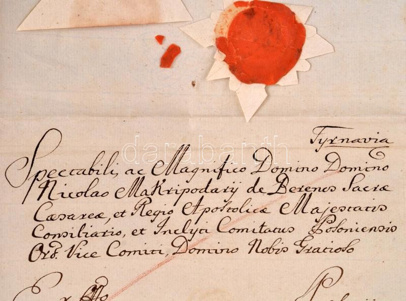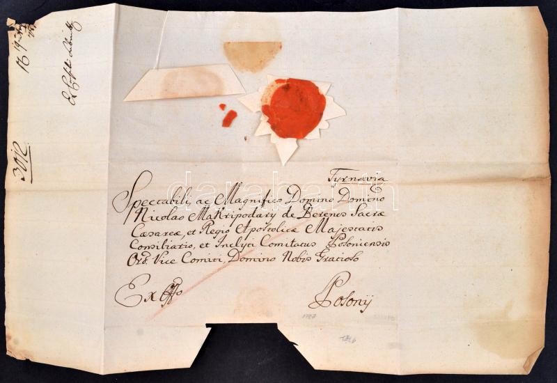 1787 Azonosítatlan személy Nagyszombatból Pozsonyba küldött hivatalos levelének borítékja, Makripodári Miklós császári-királyi tanácsos, pozsonyi alspánnak címezve, papírfelzetes viaszpecséttel