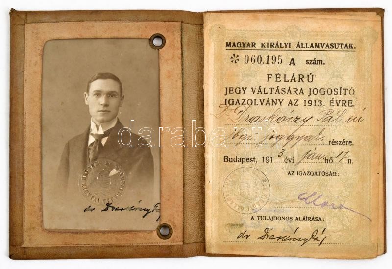 1913-1916 M. Kir. Államvasutak félárú jegy váltására jogosító arcképes... https://www.darabanth.com/hu/372-Gyorsarveres/372.0/Mutargy-papirregiseg-egyeb/Okmanyok~17/1913-1916-M-Kir-Allamvasutak-felaru-jegy-valtasara-jogosito-arckepes-igazolvany-joggya~II2175611