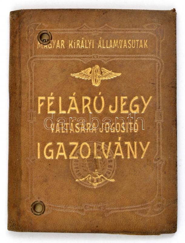Leírás: 1913-1916 M. Kir. Államvasutak félárú jegy váltására jogosító arcképes igazolvány, joggyakornok részére, aranyozott egészbőr-kötésben.