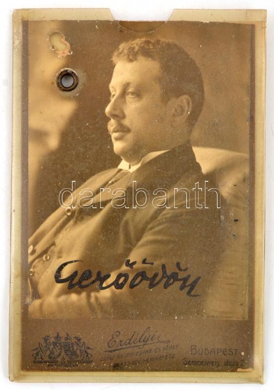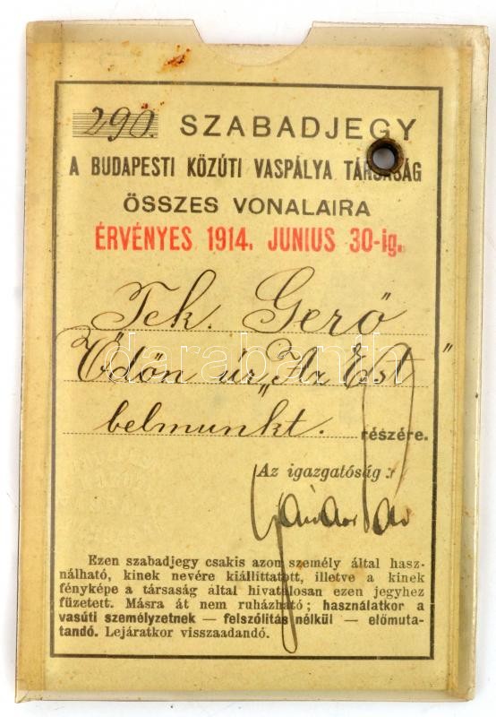 1914 Gerő Ödön (1863-1939) műkritikus, újságíró, az Est napilap belmunkatársának fényképes 290. sz.szabadjegye (igazolványa) a budapesti közúti vaspálya társaság összes vonalaira. A fénykép Erdélyi Mór (1866-1934) fotográfus, fotóriporter felvétele. Gerő Ödöün által aláírt.