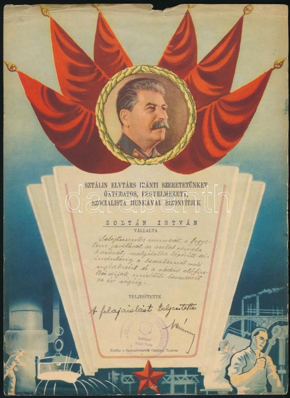 1949 Sztálin születésnapjára tett felajánlás selejtmentes munkáról https://www.darabanth.com/hu/372-Gyorsarveres/372.0/Mutargy-papirregiseg-egyeb/Okmanyok~17/1949-Sztalin-szuletesnapjara-tett-felajanlas-selejtmentes-munkarol~II2172543