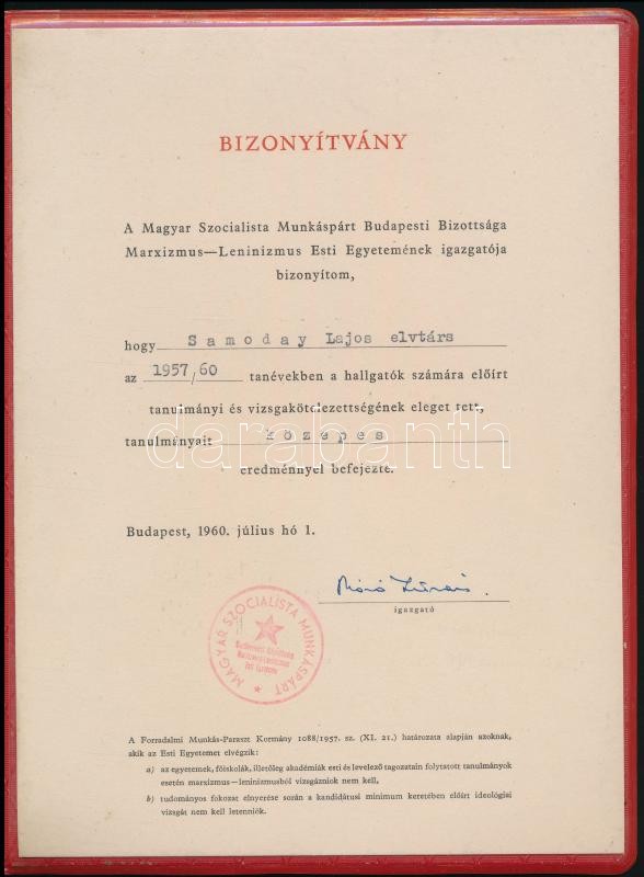 Leírás: 1957-1960 Magyar Szocialista Munkáspárt Marxizmus-Leninizmus Esti Egyeteme tanulmányi könyv + bizonyítvány