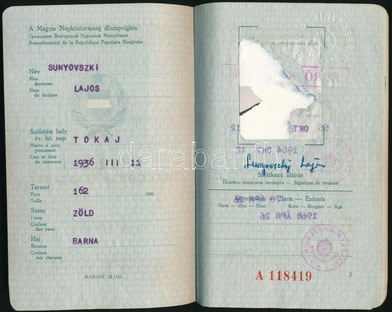 1964 Magyar Népköztársaság által kiállított útlevél német, osztrák, ol... https://www.darabanth.com/hu/372-Gyorsarveres/372.0/Mutargy-papirregiseg-egyeb/Okmanyok~17/1964-Magyar-Nepkoztarsasag-altal-kiallitott-utlevel-nemet-osztrak-olasz-belyegzessel-~II2172416