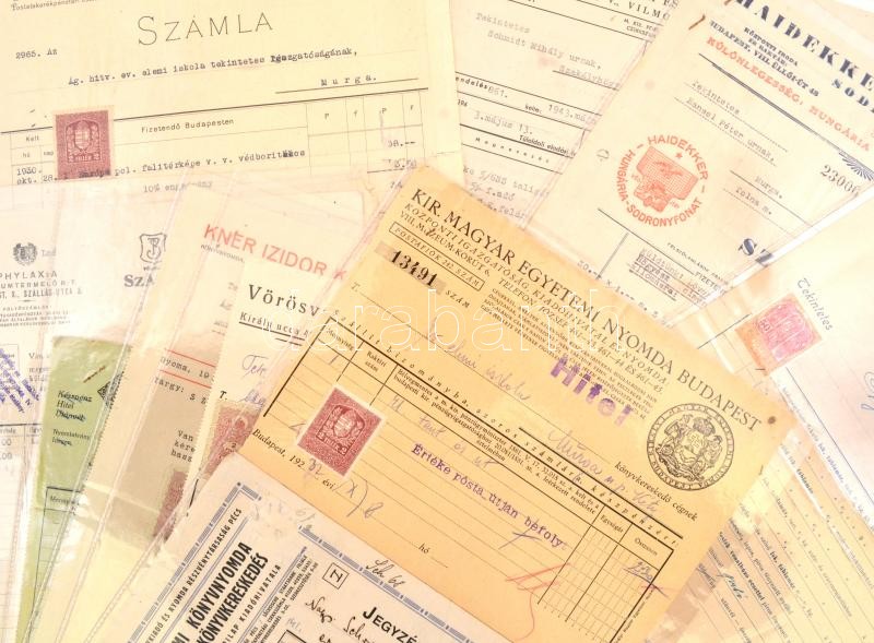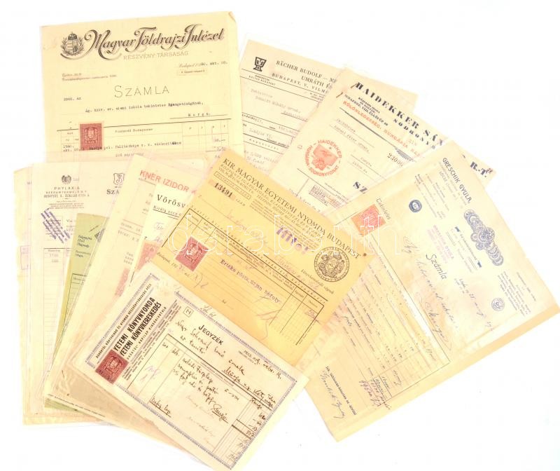 cca 1925-47 Számla tétel: Magyar Földrajzi Intézet, Kalász Könyvkiadó, Kner Izidor (számlát kísérő levél), Vörösvatzky Rezső Pécs, Greschik Gyula Lőcse, stb. Hajtásnyommal, részben szakadásokkal.