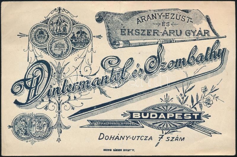 1928 Wintermantel és Szombathy Arany-ezüst és Ékszeráru Gyár, Bp., Dohány utca 7. sz. reklám nyomtatvány, a hátoldalán számlával, a cég bélyegzésével, 4 F okmánybélyeggel, 9x14 cm