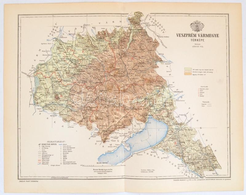 1893 Veszprém vármegye térképe, tervezte: Gönczy Pál, Posner Károly Lajos és Fia térképészeti műintézetének metszése és nyomása, Pallas Nagy Lexikona, 1:430.000, 24×30 cm