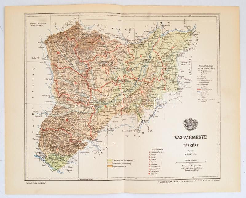 1894 Vas vármegye térképe, tervezte: Gönczy Pál, Posner Károly Lajos és Fia térképészeti műintézetének metszése és nyomása, Pallas Nagy Lexikona, 1:520.000, 24×30 cm