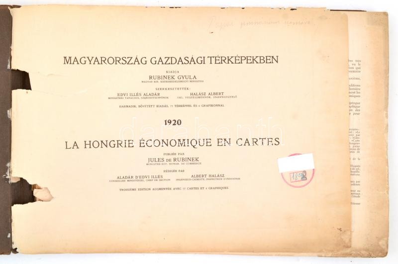 1920 Magyarország gazdasági térképekben. La Hongrie Économique en Cartes. Kiadja Rubinek Gyula. Szerk. Edvi Illés Aladár és Halász Albert. Harmadik, bővített kiadás. Magyar és francia nyelven. Bp., 1920., ,,Pátria", 3 sztl. lev.+76 t. (feliratos hártyapapírral védett térképek és grafikonok.) A mű 77 térképpel és 6 grafikonnal teljes. A kihajtható térkép hiányzik. Kiadói haránt alakú papírkötés, kopott borítóval, a borító széleken kis szakadásokkal, sérült gerinccel, a könyvtest sérült, az utolsó lap és a címlap kivételével a könyvtest elvált a borítótól, kisebb lapszéli foltokkal, egy lapszélen kis sérüléssel.