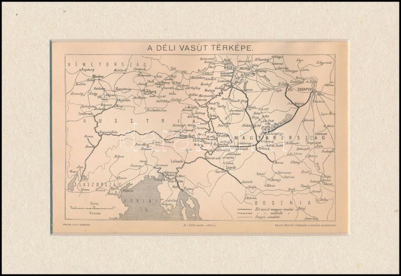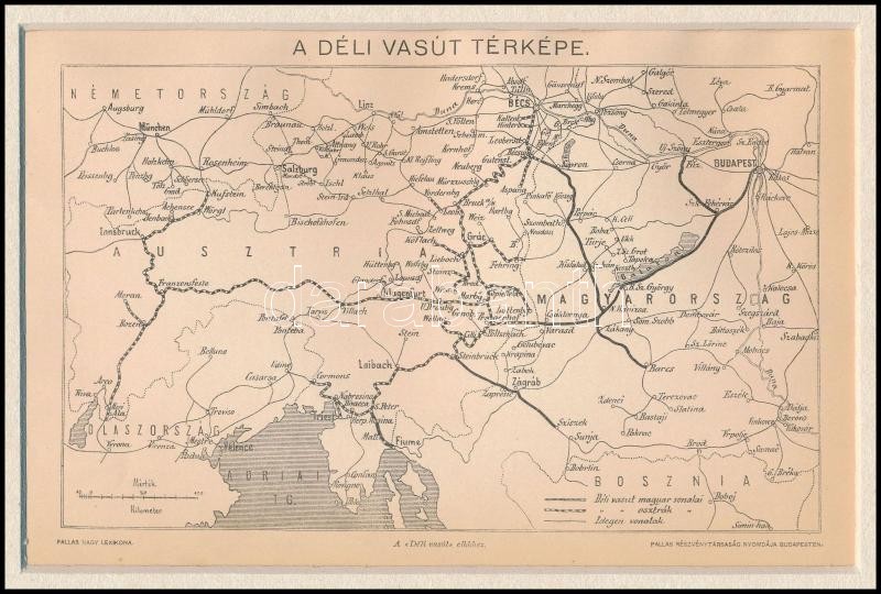 Leírás: cca 1898 Déli vasút térképe, Bp., Pallas Nagy Lexikon, paszpartuban, 14x21 cm