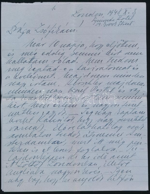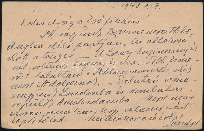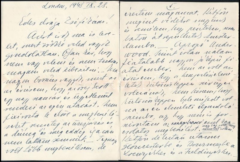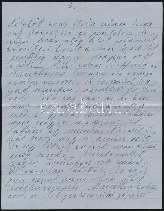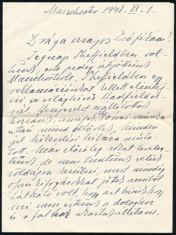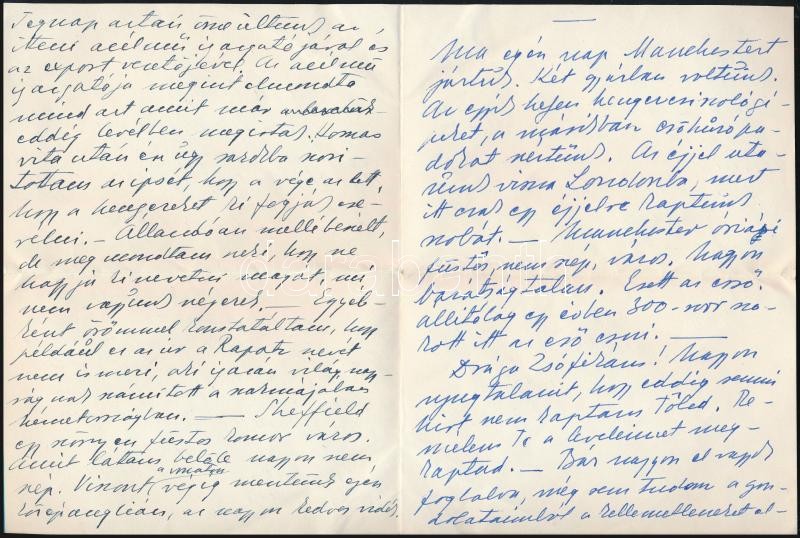 1948.IX.28-29. Geleji Sándor (1898-1967), a csepeli Weiss Manfréd Acél- és Fémművek igazgatója (1945-49) részben személyes hangú levelei és levelezőlapja feleségének Angliából Budapestre, amelyben beszámol üzleti útjáról. Panaszkodik, hogy az angliai kapcsolattartója nem szervezte meg előre az időpontokat. Közli, hogy az egyik legnagyobb londoni fémkereskedővel tárgyalt, aki szívesen együttműködnének, ha " a kereskedelmi szerveink nem volnának annyira nehézkesek és a kérdéseikre felelnének is". Valamint kitér arra is, hogy Bedfordban egy gyárban tárgyalt egy Davies n. műszaki vezetővel és a Weiss Manfréd Művekkel kapcsolatos problémákat átbeszélték. Beszámol Manchesteri gyárlátogatásról, egy reklamáció intézéséről és sok más egyéb részletről, amely adalék a Weiss Manfréd Acél- és Fémművek angliai kapcsolatairól. Össz. kb. 20 kézzel írt oldal.