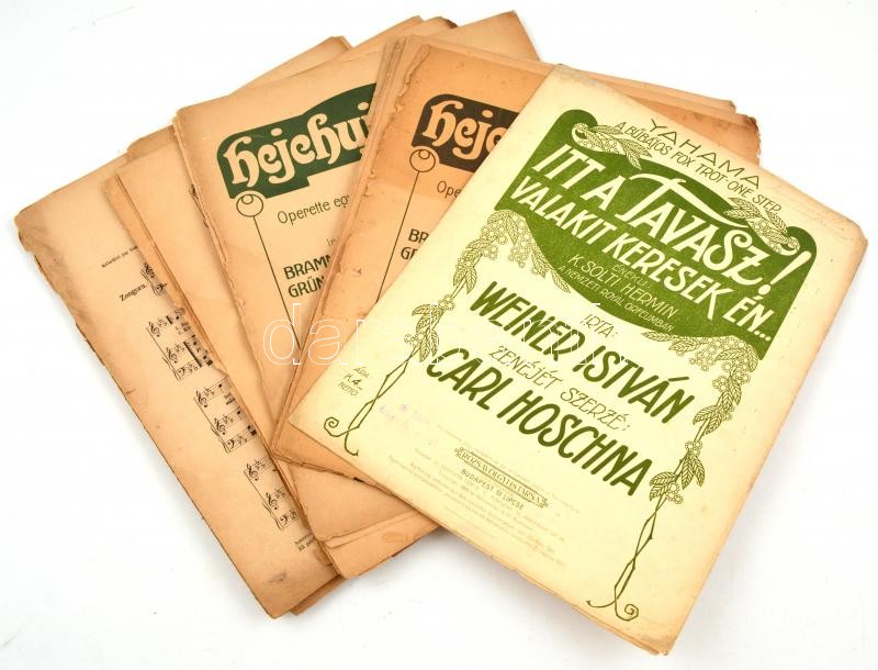 Leírás: Vegyes sérült kotta tétel - Ascher Leo: Hejehuja Báró, Carl Hoschna: Itt a tavasz! Valakit keresek én...; stb., 4 db