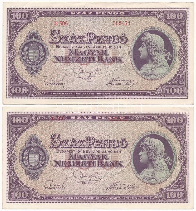 Leírás: 1945. 100P (2x) sorszámkövetők, "E306 085472" sorszámú bankjegyen látványosan fölfelé csúszott sorszám! T:I- saroktörés