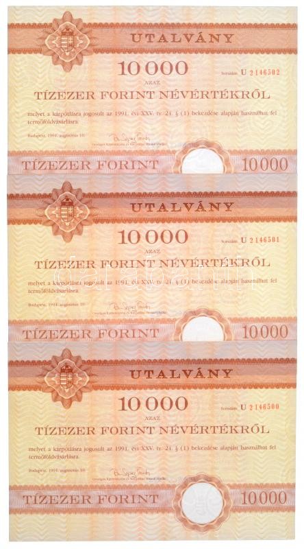 Leírás: 1991. Kárpótlási jegyről szóló utalvány 10.000Ft-os névértékben (6x) sorszámkövetők "2146500-2146506", "U" sorozat", szárazpecséttel T:I