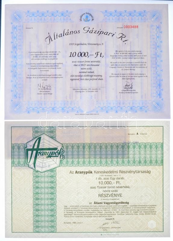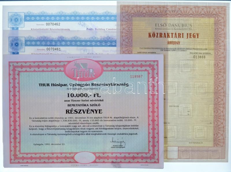 Leírás: 1991-1993. 5db részvényből álló tétel + 1db "Első Danubius Közrakzározási és Kereskedelmi Zrt." közraktári jegy T:I-II