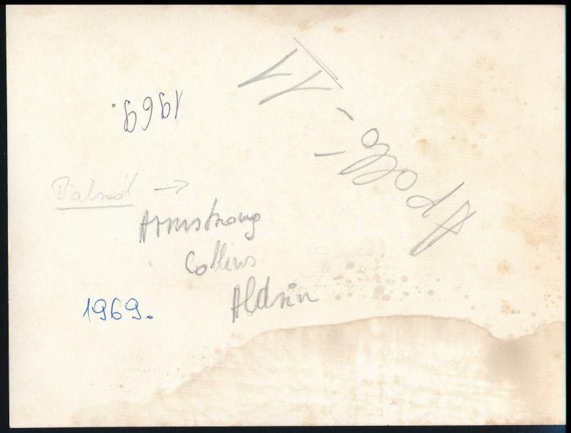 Leírás: 1969 Neil A. Armstrong, Michael Collins, Edwin E. Aldrin amerikai űrhajósok, az Apollo-11 személyzetéről készült fotó, hátulján felirat, 11,5x15,5 cm