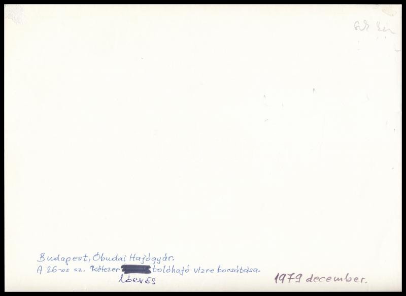 Leírás: 1979 Az Óbudai Hajógyár 26-os sz. tolóhajó vízre bocsátásának fotója, hátulján felirat, 18x24,5 cm