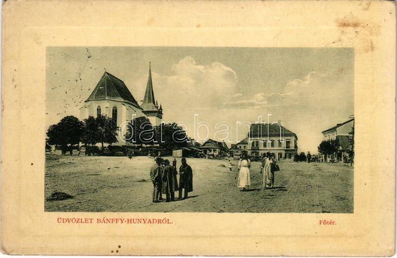 1912 Bánffyhunyad, Huedin; Fő tér, Református templom, üzletek, piac. W. L. Bp. 7085. Diamantstein Nándor kiadása / main square, Calvinist church, shops, market + "KOLOZSVÁR - BUDAPEST 298. SZ. A" vasúti mozgóposta bélyegző (EK)