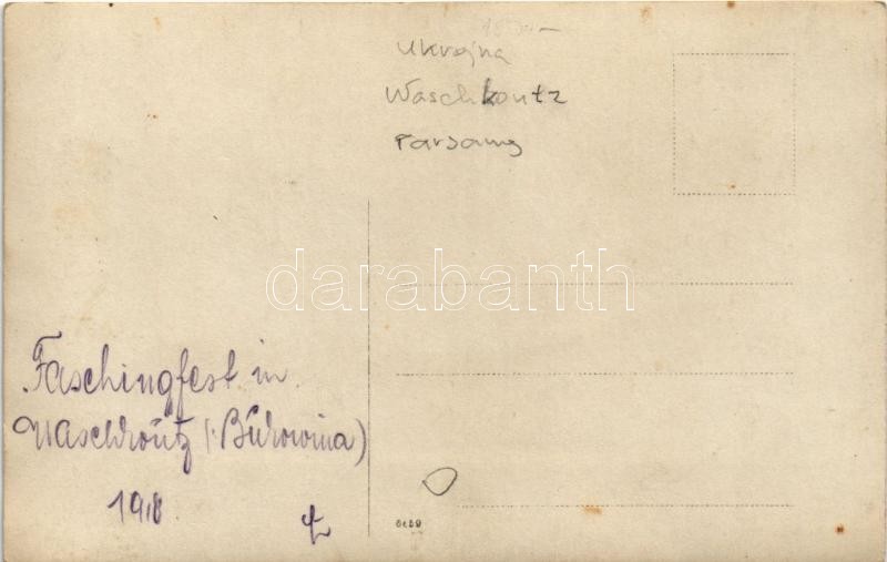 1918 Vashkivtsi, Waschkoutz (Bukovina, Bukowina); Faschingfest (Farsan... https://www.darabanth.com/hu/373-Gyorsarveres/373.0/Kepeslapok/Folklor~1500067/1918-Vashkivtsi-Waschkoutz-Bukovina-Bukowina-Faschingfest-Farsang-folklore-carnival-photo~II2183919