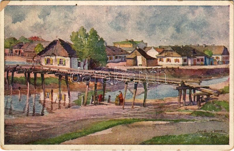 1917 Képek a Wolhyniai városokból. A 4. Hadsereg az özvegyeknek és árváknak / Wolhynische Städtebilder / WWI Austro-Hungarian K.u.K. military, street view from Volhynia, wooden bridge. artist signed (kopott sarkak / worn corners)