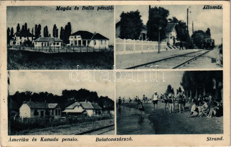 Leírás: 1934 Balatonszárszó, vasútállomás, Magda, Balla, Amerika és Kanada penziók, strand