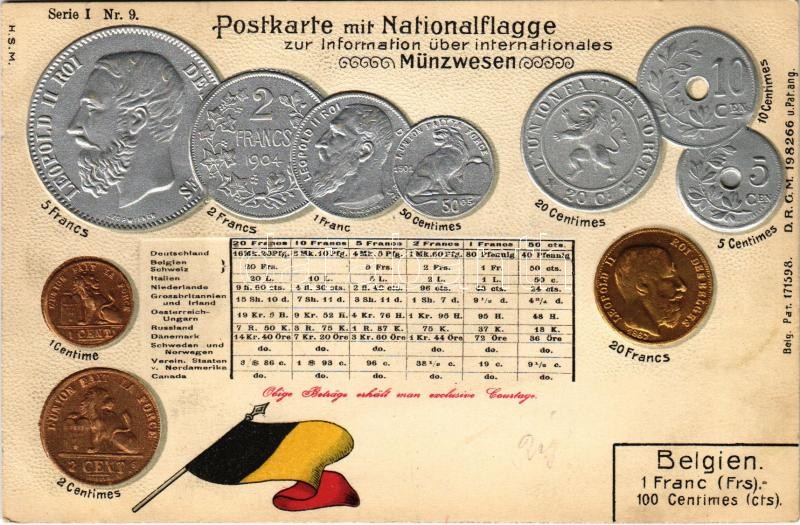 Leírás: Belgien. Postkarte mit Nationalflagge zur Infoprmation über internationales Münzen / Beglian coins and flag. Serie I. Nr. 9. Emb. litho