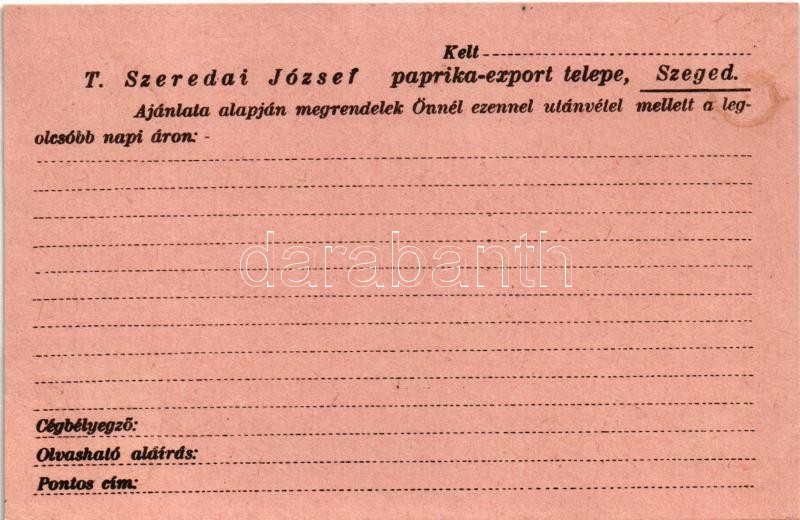 Szeredai József szegedi paprika export telep reklámlapja / Hungarian p... https://www.darabanth.com/hu/373-Gyorsarveres/373.0/Kepeslapok/Reklam~1500088/Szeredai-Jozsef-szegedi-paprika-export-telep-reklamlapja-Hungarian-pepper-export-advertising-car~II2183047
