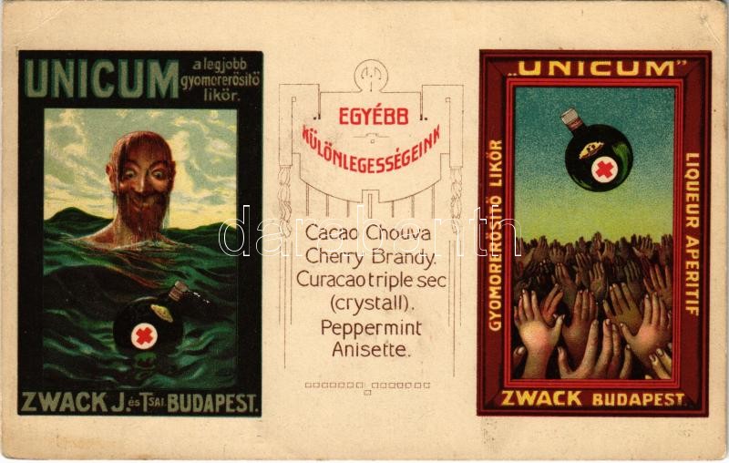Leírás: Unicum gyomorerősítő likőr reklámlap. Zwack J. és társai. Budapest / Hungarian stomachic liqueur advertisement, litho (EK)