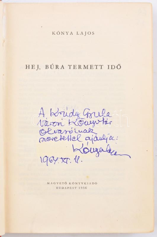 Leírás: Kónya Lajos: Hej, búra termett idő. Bp., 1956., Magvető. Kiadói kopott félvászon-kötés, volt könyvtári példány. A szerző által dedikált.