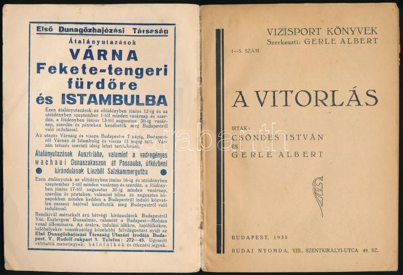 Leírás: Csöndes István-Gerle Albert: A Vitorlás. Vizisport könyvek. Szerk.: Gerle Albert. Kihajtható kilométer táblával, egészoldalas, illetve szövegközti fekete-fehér fotókkal. Bp, 1935, Budai Nyomda. Kiadói papírkötésben, foltos, enyhén kopottas állapotban.