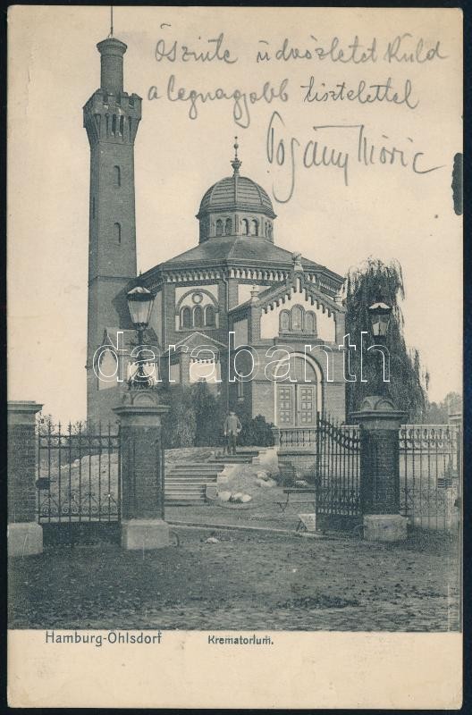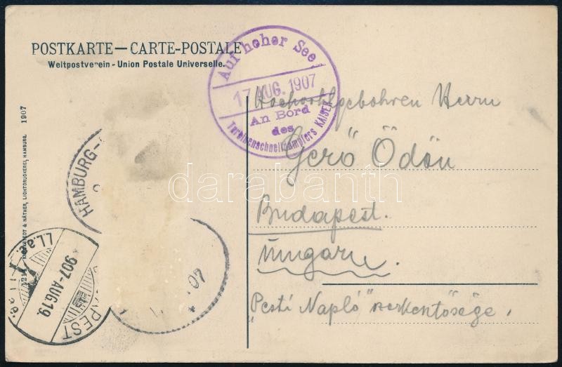 1907 Pogány Móric (1878-1942) magyar építész, urbanista, egyetemi tanár; grafikusművész üdvözlőlapja Hamburgból, Gerő Ödön (1863-1939) újságírónak, a Pesti Napló szerkesztőségébe küldve, auf hoher See, an Bord des Turbinendampfers Kaiser bélyegzővel.
