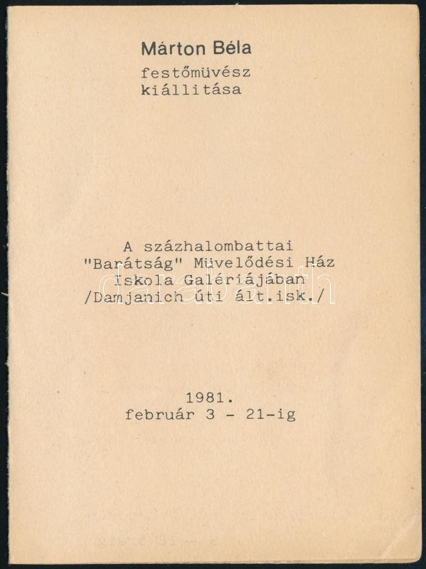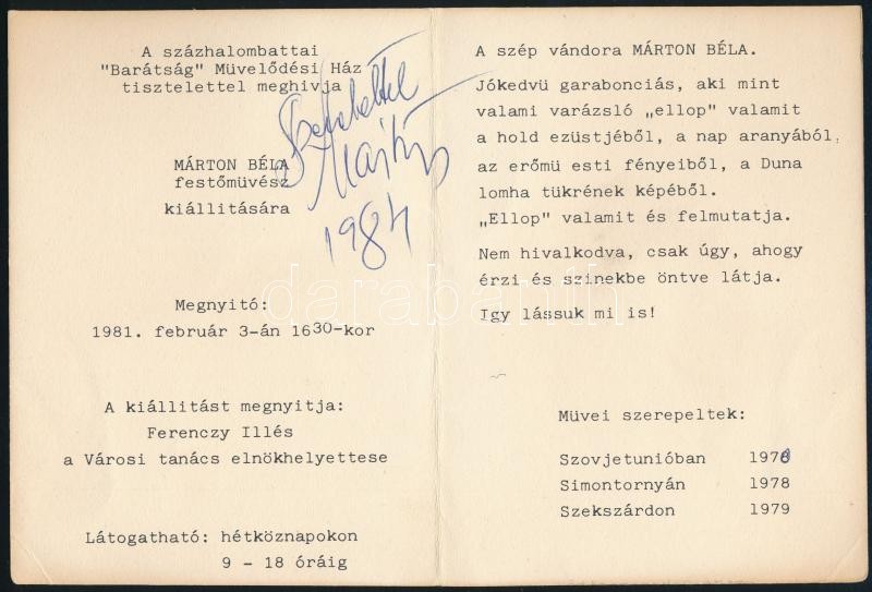 Leírás: Márton Béla (1913-2007) festőművész aláírása saját, Százhalombattán rendezett kiállításának meghívóján