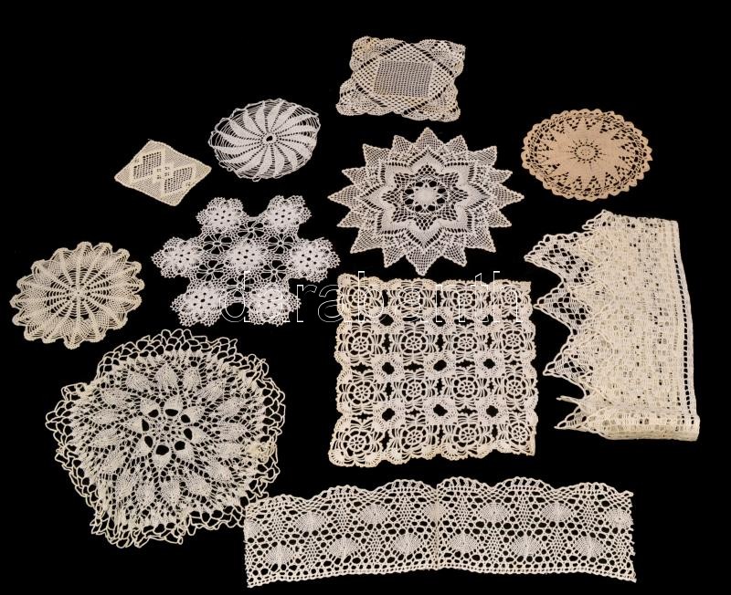 Leírás: 2db csipke szegély, 150x10 cm és 200x10 cm + 13 db különböző méretű csipkék, horgolások