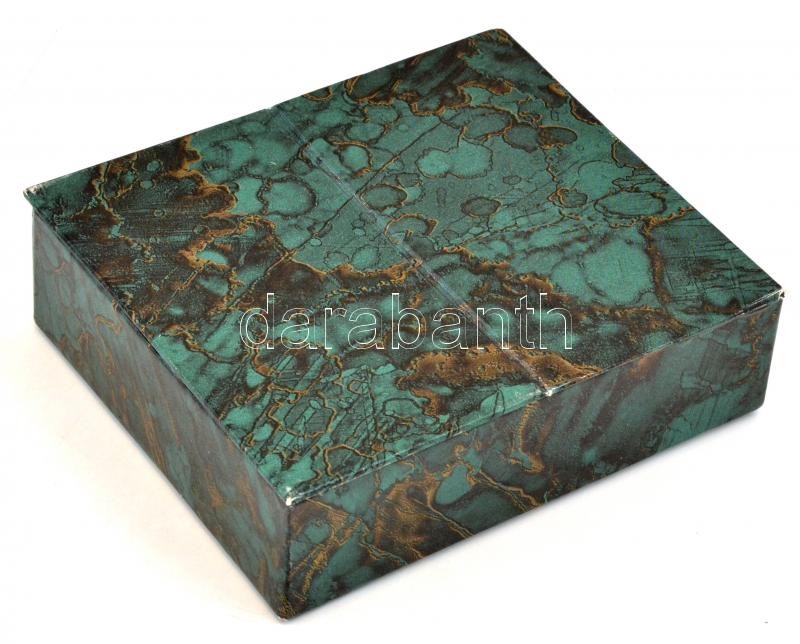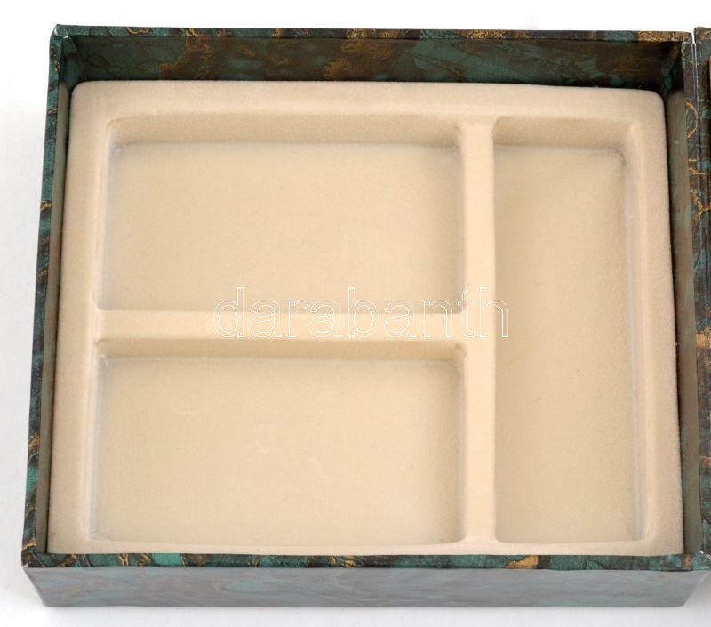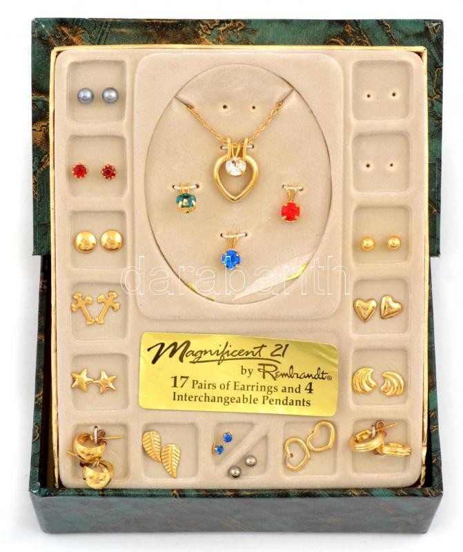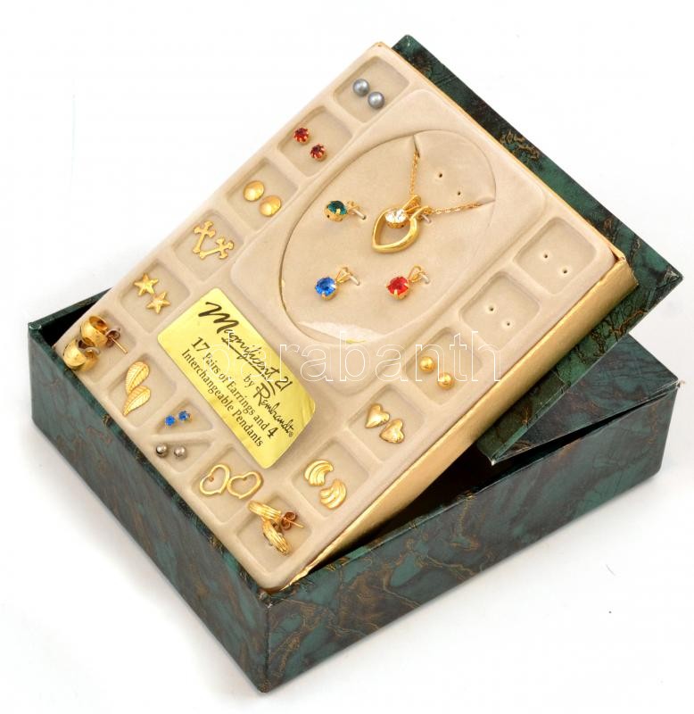 Bizsu tétel dobozban, fülbevalókkal és nyaklánccal, cserélhető függőkkel, nagyrészt aranyozottak, némelyik színes kővel, 2 pár fülbevaló és egy függő hiányzik, 15,5x13x4,5 cm