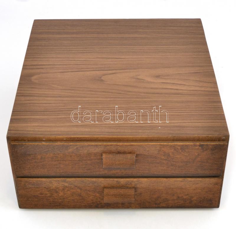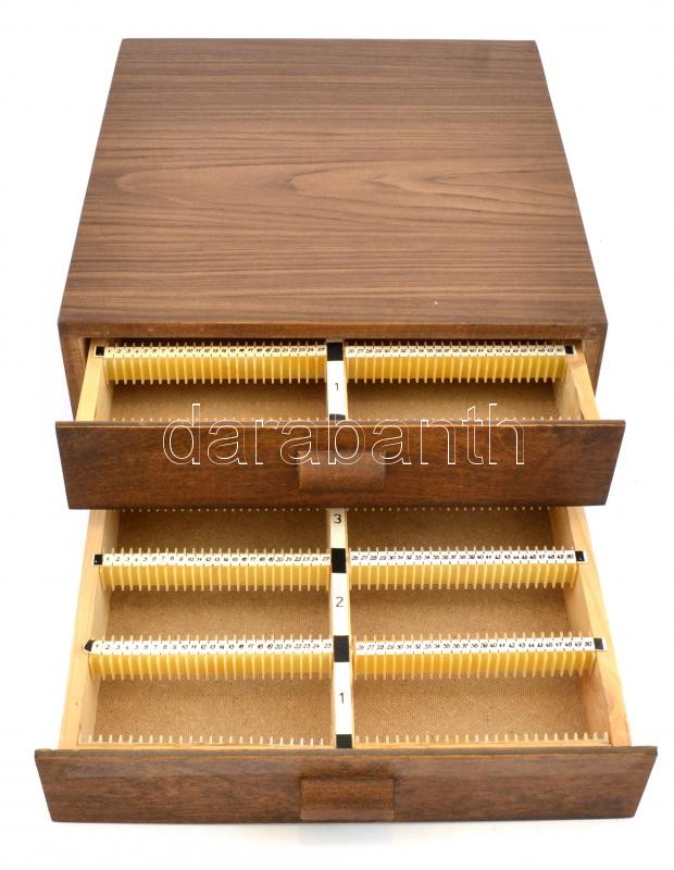 Leírás: Diatárolásra kialakított kis méretű fa bútor, 2 fiókkal, össz. 500 dia tárolási kapacitással, jó állapotban, 15×34x32 cm