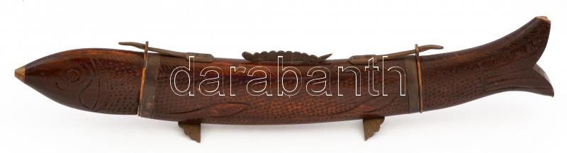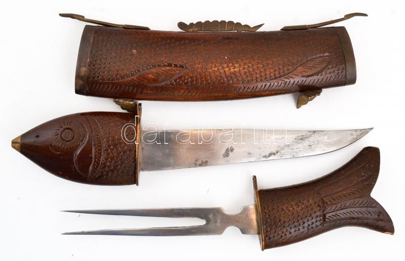 Hal alakú kés/húsvilla, faragott fa markolattal, és tokkal, fém részekkel, a pengéken jelzett, a farka egyik ágán sérüléssel, lepattanással, pengék: 19,5 cm, 15,5 cm, 6x41 cm