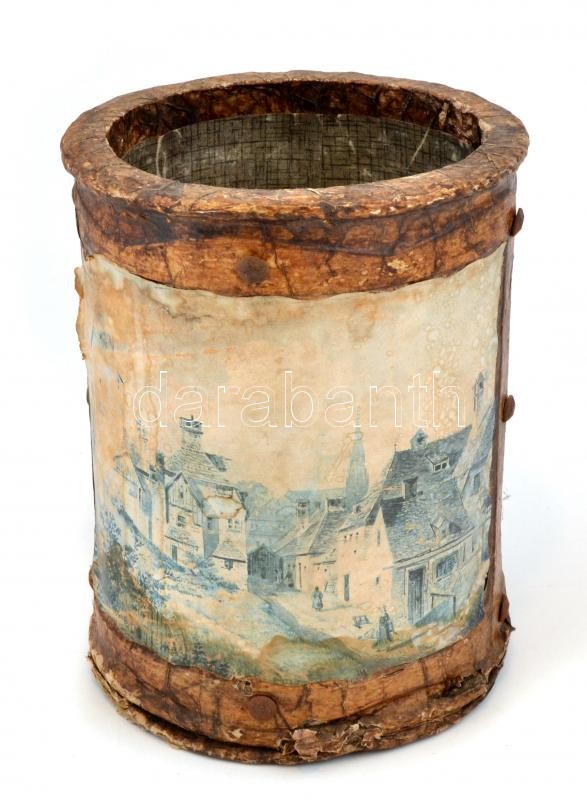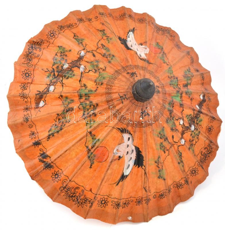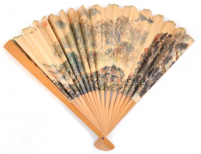 Japán stílusú fa-papír legyező, és fa-papír festett napernyő, kisebb szakadásokkal, lyukakkal; legyező: 26x40, ernyő h: 48 d: 51,5 cm + fa-papír ernyőtartó, városi képpel borítva