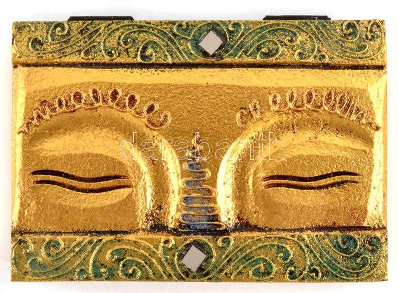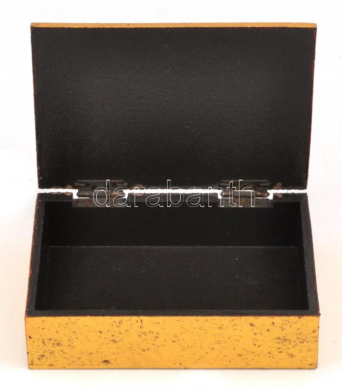 Leírás: Keleties motívumú festett fa ékszerdoboz, kopásokkal, tükrös berakással 11x15x4,5